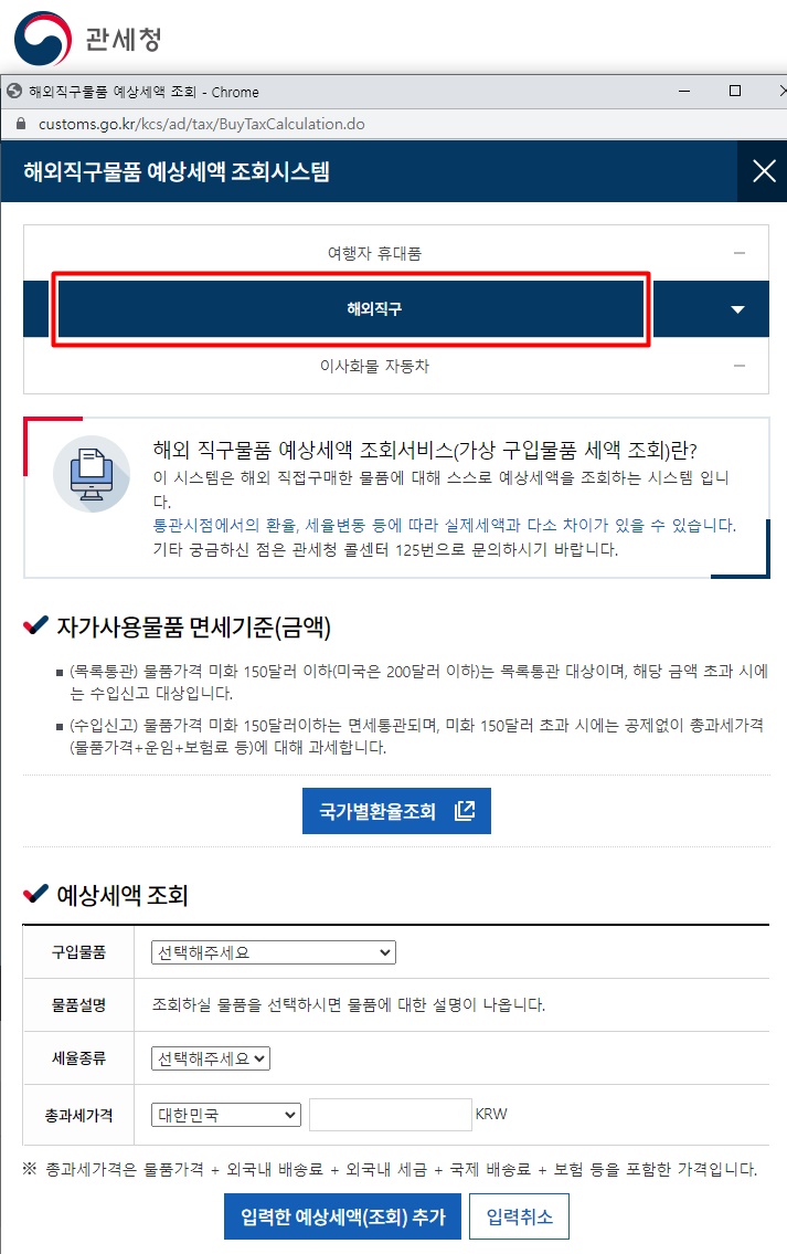 가장 간단하게 150달러(미국 200달러) 이하라면 면세대상이지만 초과되는 물품을 구매할 때는 예상세액을 조회하여 추가로 부담해야 할 금액을 알고 주문을 해야 합니다.