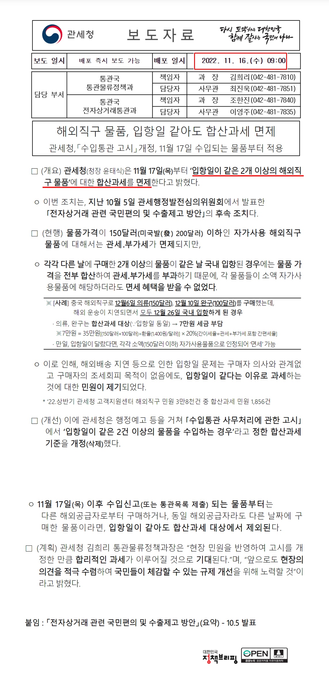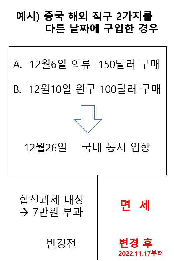 2022년 11월 17일(목) 이후 부터는 개인의 해외직구 물품의 합산과세 제도가 변경되어, 다른 해외 판매자 또는 동일 해외 판매자라도 구매날짜가 다른 경우 입항일이 같더라도 합산과세에서 제외되어 물품가격이 150달러 이하면 면제된다.
