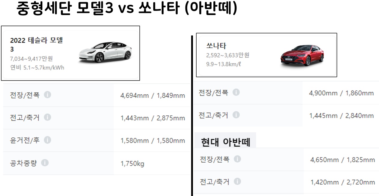 차량 급에 대한 구분(중형, 준중형, 준대형, 대형)은 누가 정하는 것인지? 테슬라와 현기차의 실제 크기 차이는 어떻게나 되는지 정확한 치수를 찾아보았습니다.