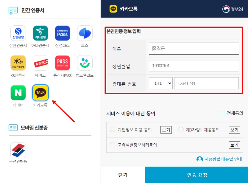 이름과 생년월일 휴대폰 번호를 입력 후 동의~ 동의 인증클릭 하면 카톡으로 바로 메세지가 오네요.