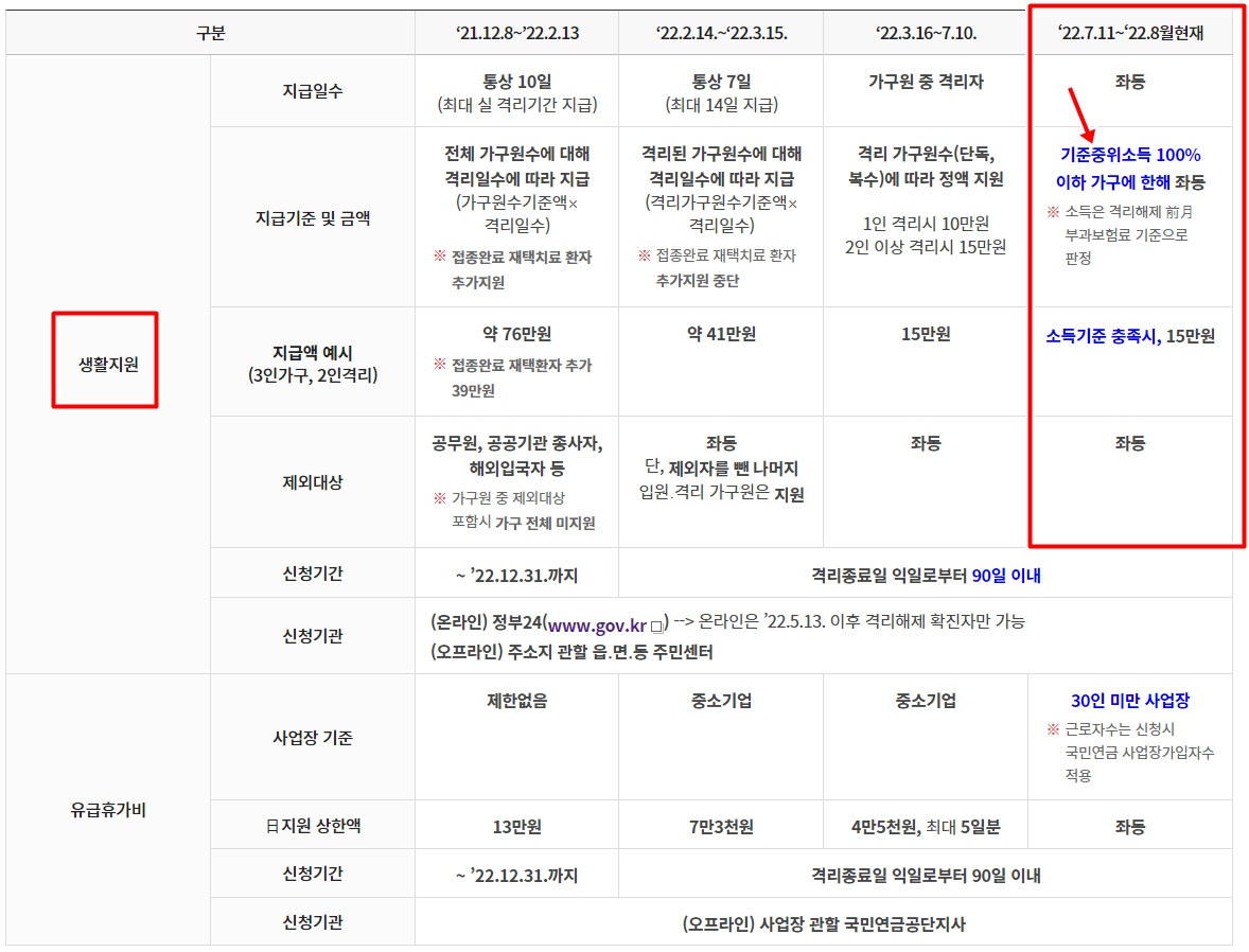 22년7월11일 ~ 현재까지 생활비 지원 정책은 기준중위소득 100% 이하 가구에 한해 현금지원 합니다.