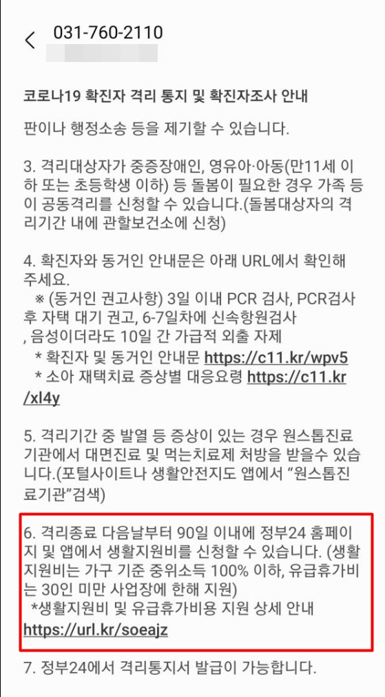 병원에서 확진판정을 받고 나서 즉시 정부에서 보낸 문자가 옵니다. 격리기간과 주의사항 그리고 생활비지원에 대한 안내 링크를 함께 보내주죠.