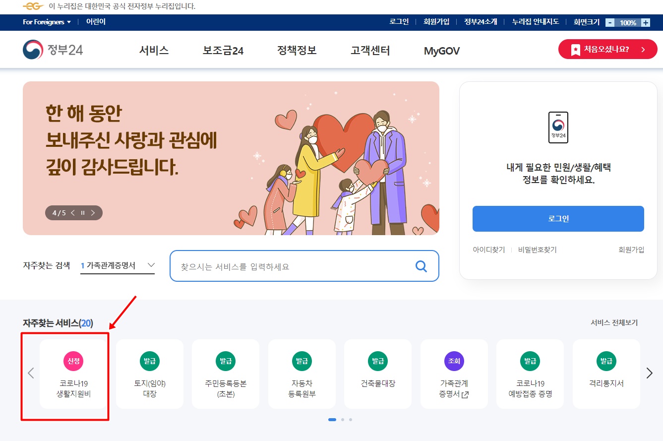 정부24 홈페이지 중간에 자주찾는 서비스 중에서도 빨간색으로 눈에 잘 보이게 만들어 두었네요.