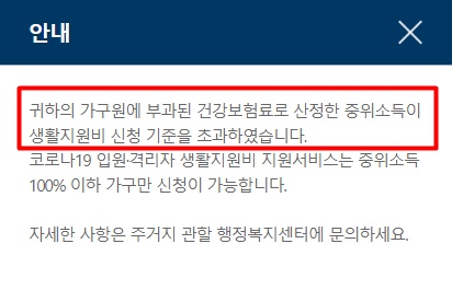 귀하는~~ 건강보험료로 산정한 중위소득이 생활지원비 신청 기준을 초과 하였다고 합니다.