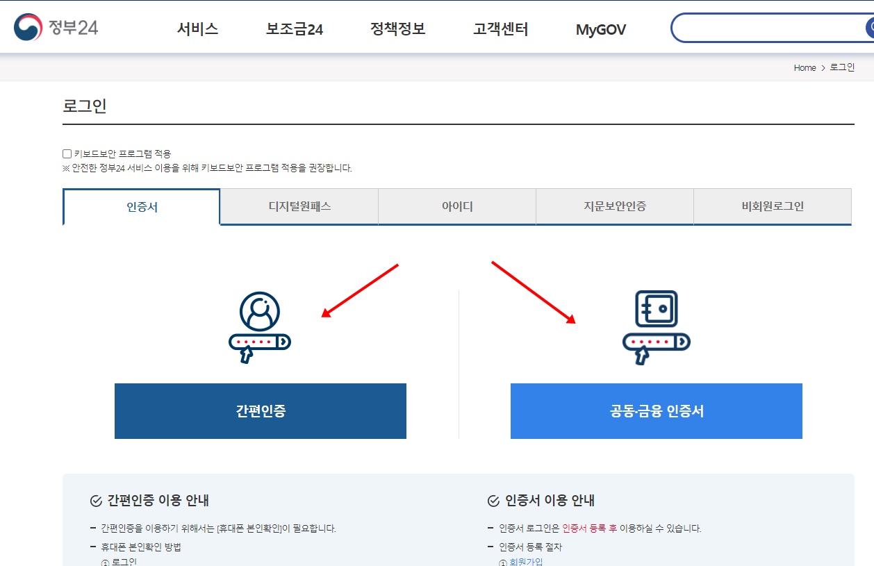 간편인증 또는 공인인증서 등을 사용해서 로그인 해줍니다.
